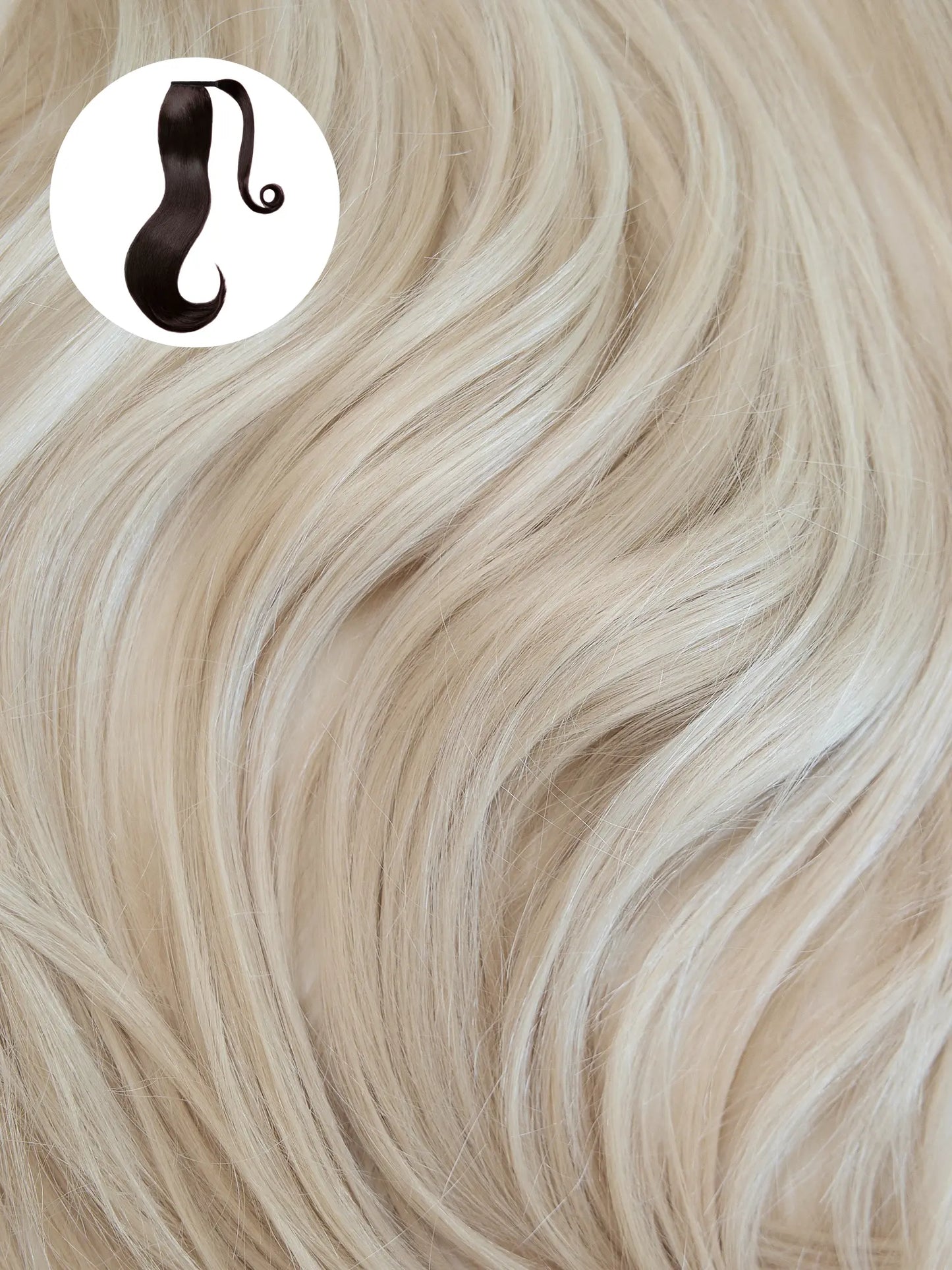 Most ponytail hair extensions are single-drawn and thin, but all Bombay Hair's Clip in Hair Extensions are 100% Real Human Hair and double-drawn. Meaning our hair is thick from root-to-tip. Bombay Hair has sourced out the most beautiful Cuticle Remy hair in the world, and has 100% of the cuticle intact allowing for tangle-free and smooth hair that doesn't dry out quickly. Our Cuticle Remy hair quality is unmatched!