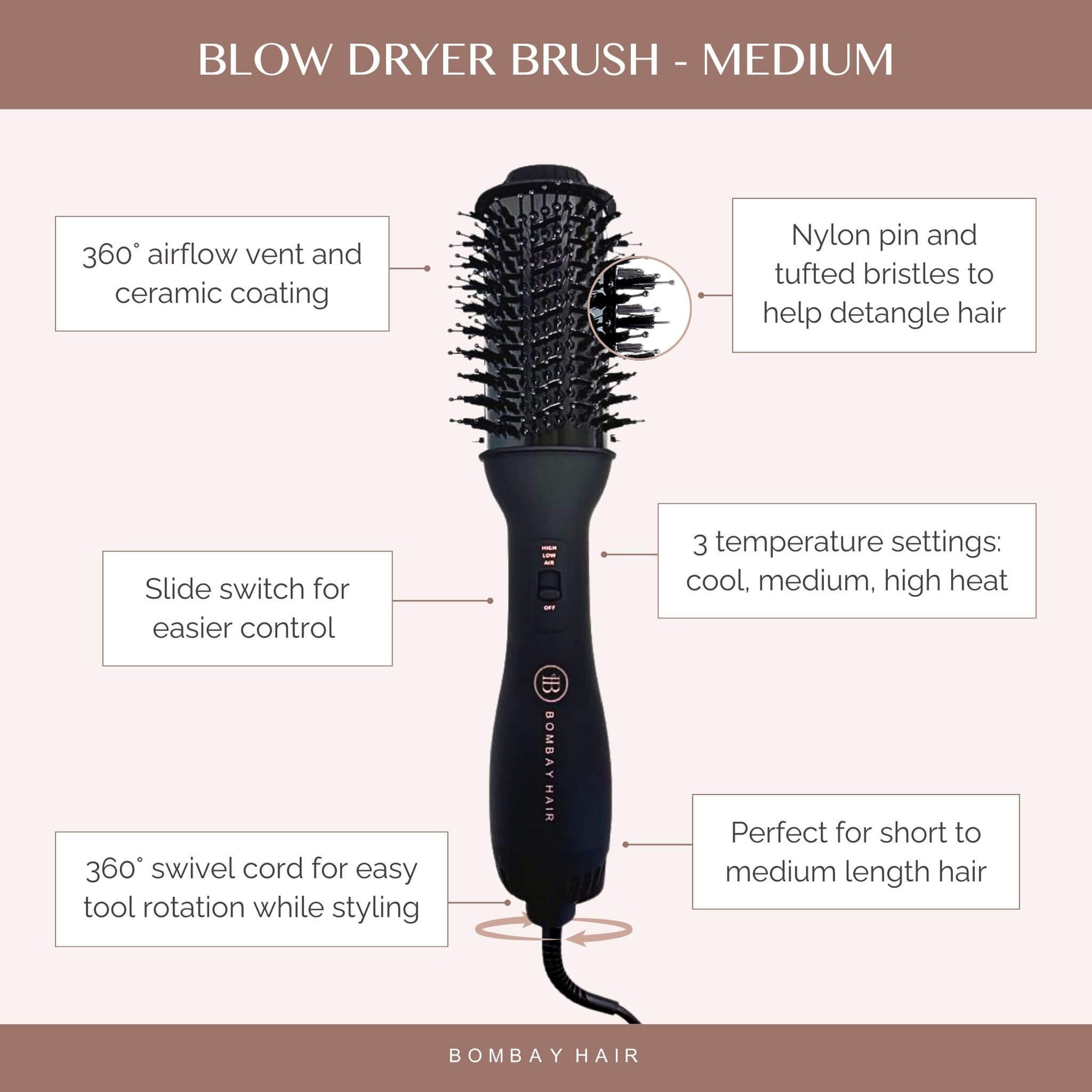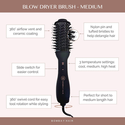 Styling is easy with Bombay’s blow dryer brush. In a few simple steps, you can have the perfect hair for any occasion: